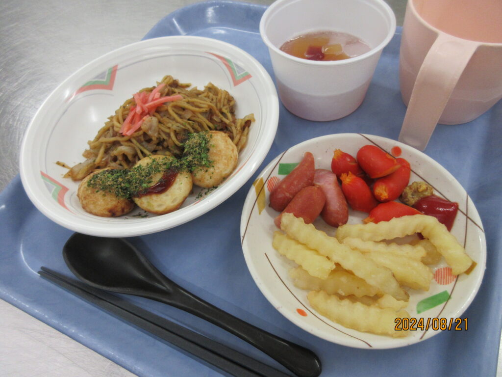 夏祭りメニューを提供しました。テーマは屋台の雰囲気を楽しもう!焼きそば・たこ焼き・ウィンナーとポテトにカクテルゼリーを楽しんでもらえました。