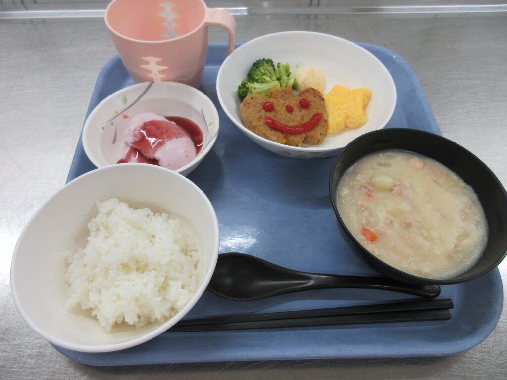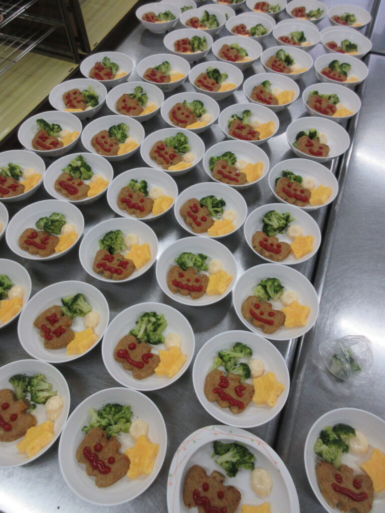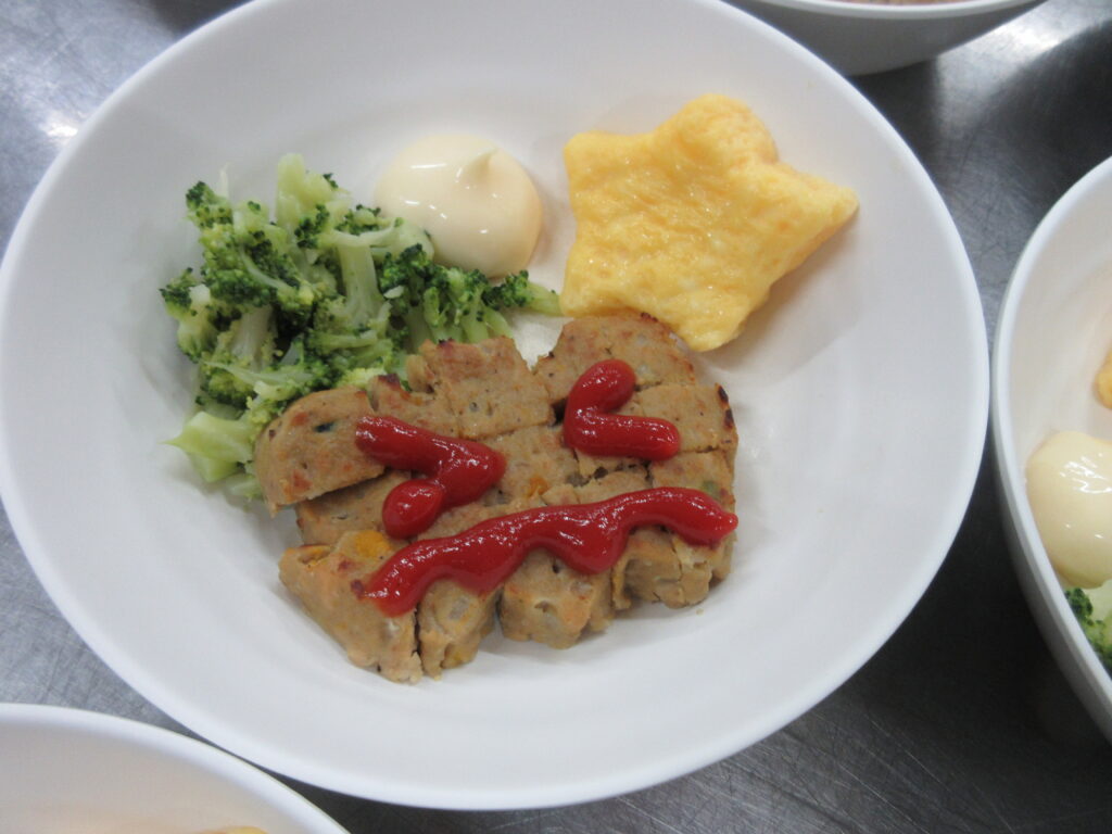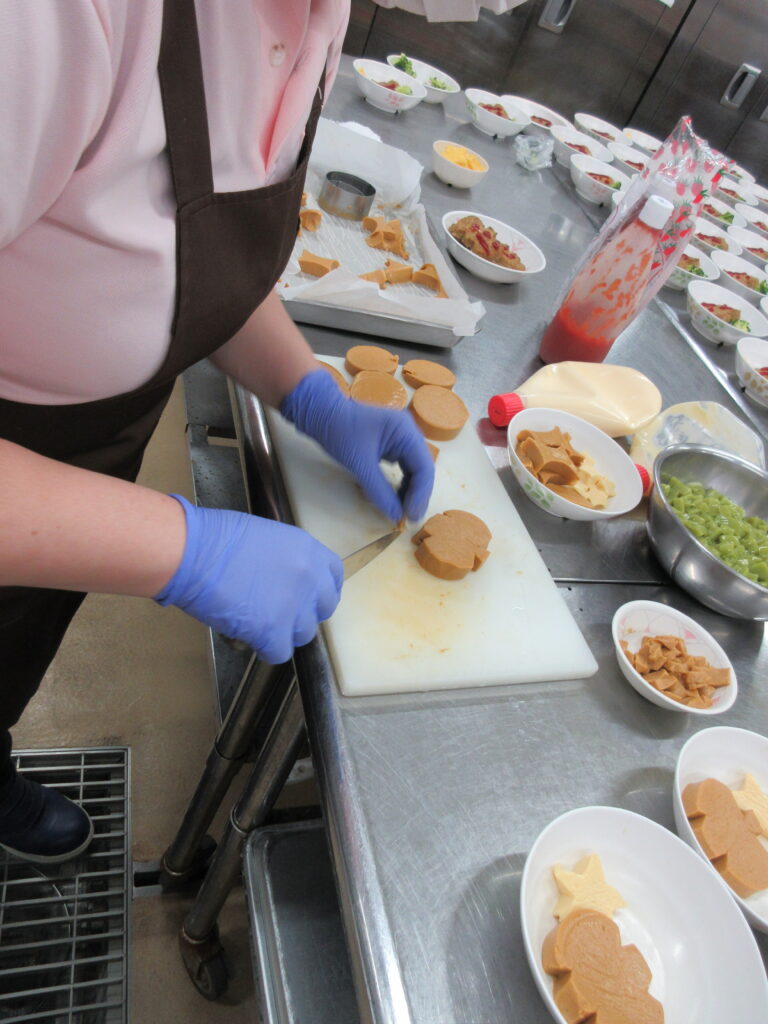 調理員の手にかかると、かぼちゃ型のハンバーグが表情豊かになりました。