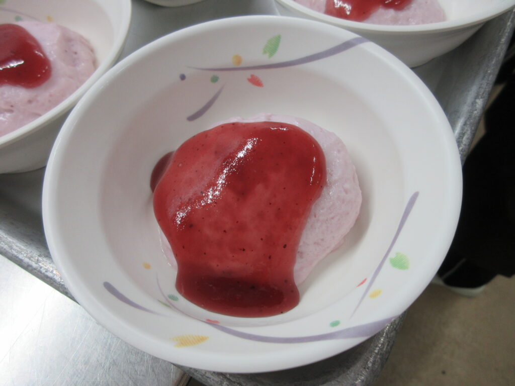 また、ハロウィンらしくむらさき色のさっぱりしたヨーグルトムースに、甘いソースをかけました