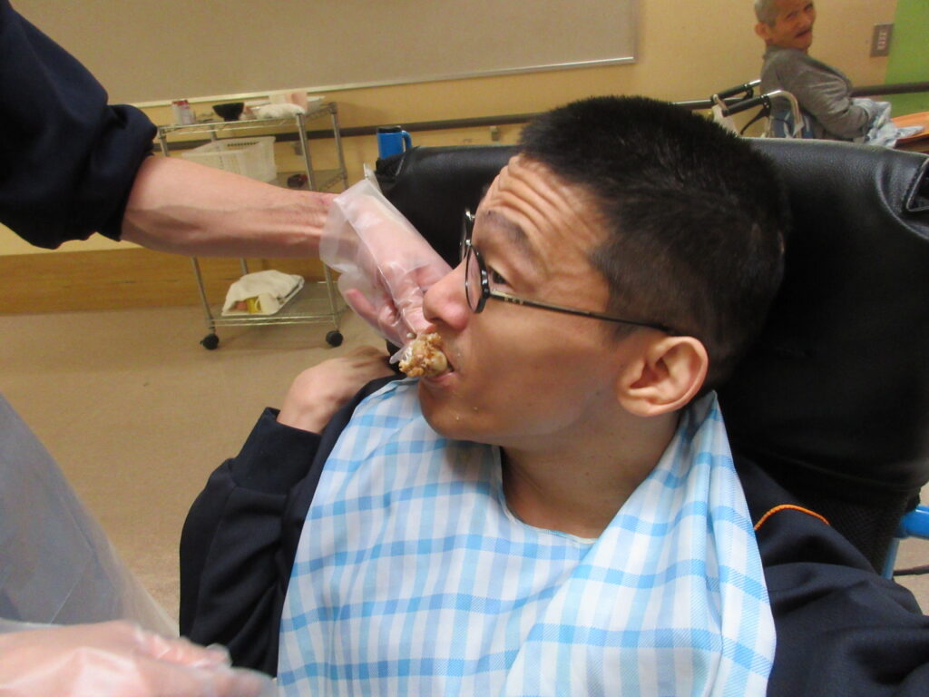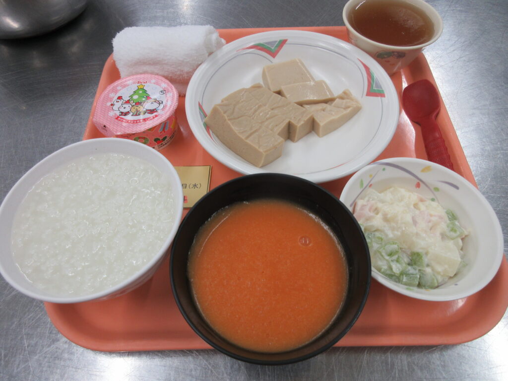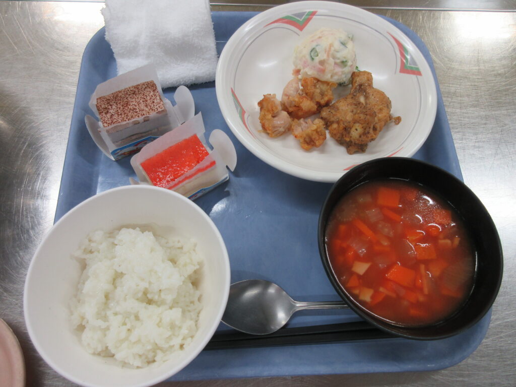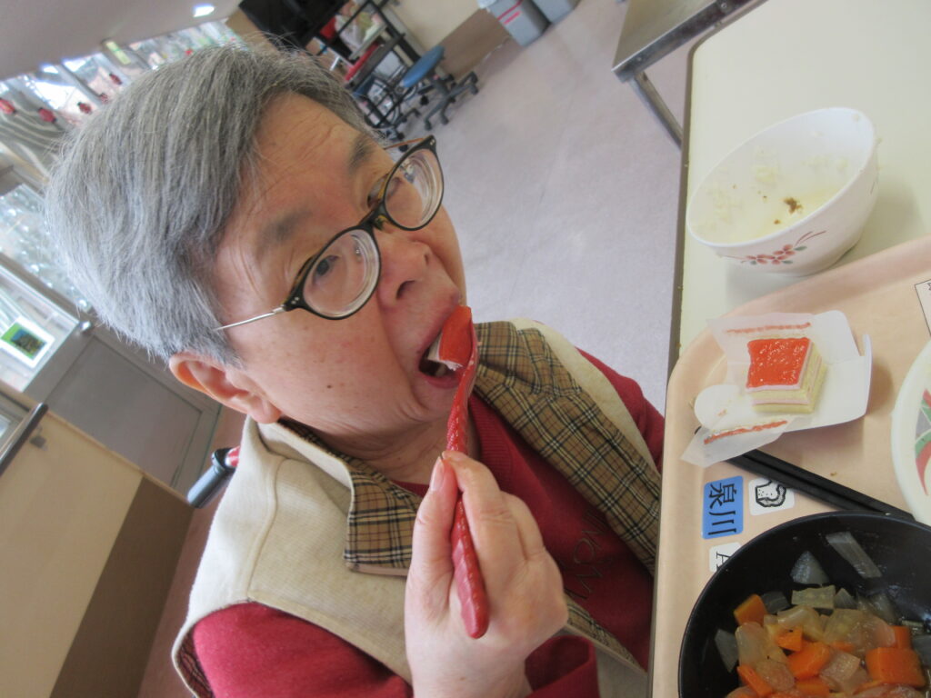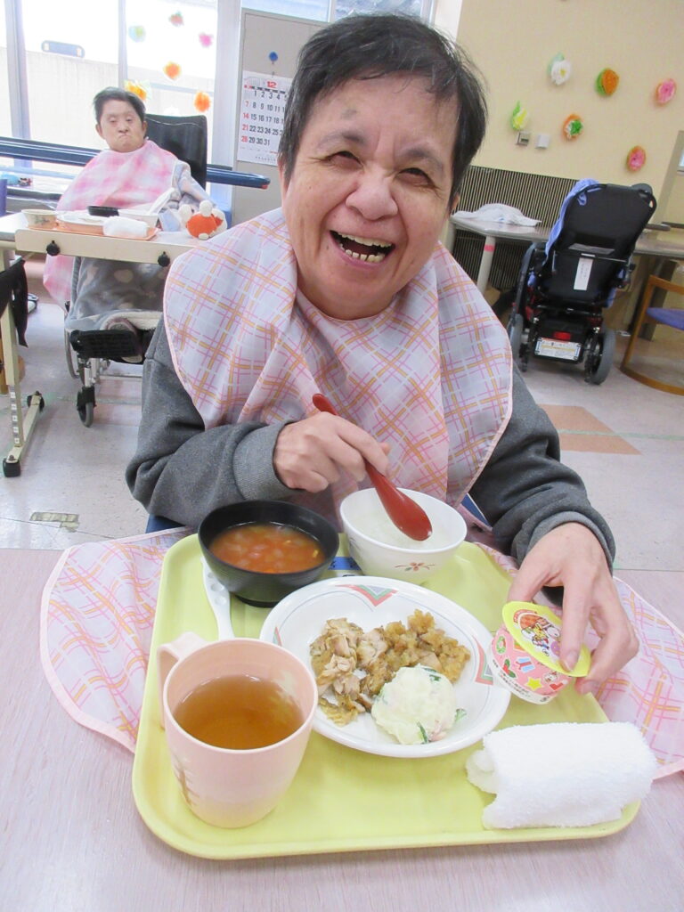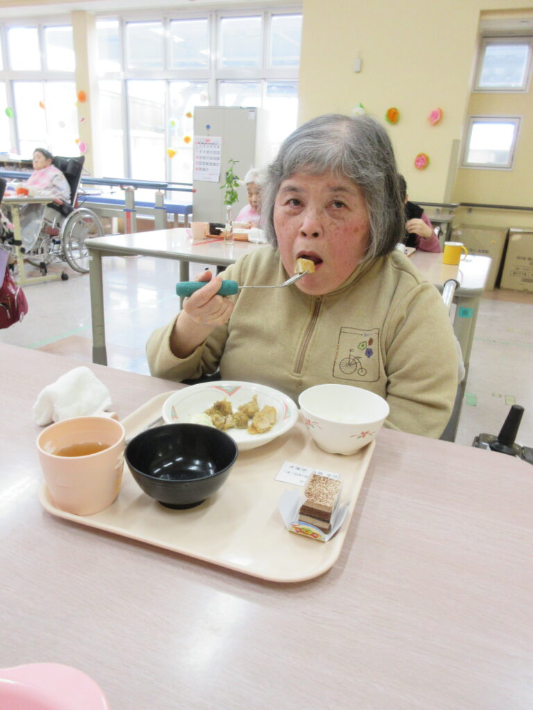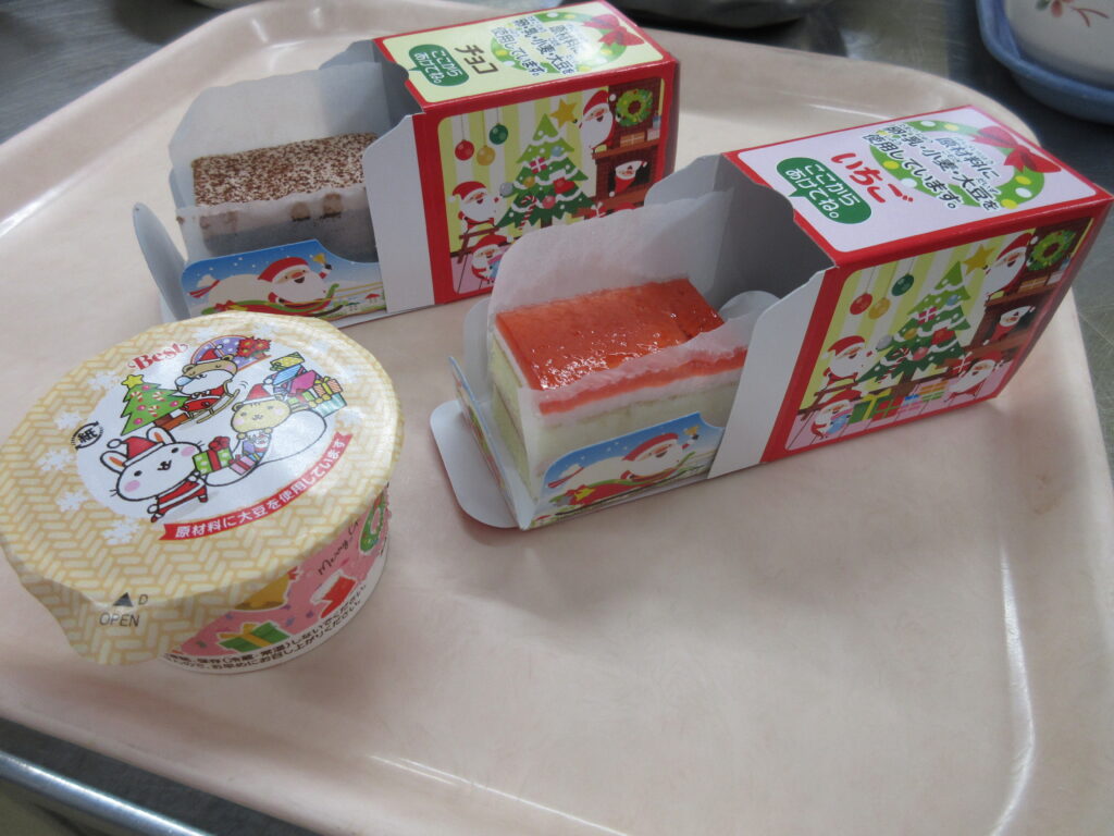 クリスマス献立を提供しました。骨付きの手羽元や唐揚げ、ポテトサラダ等とクリスマスケーキを提供いたしました。ケーキは事前に3種類(チョコ・いちご・プリン)から選んでいただき、お好みのものを食べていただきました。骨付きの手羽元にかぶりつき、クリスマスの音楽を聴きながら、楽しい食事ができました。
