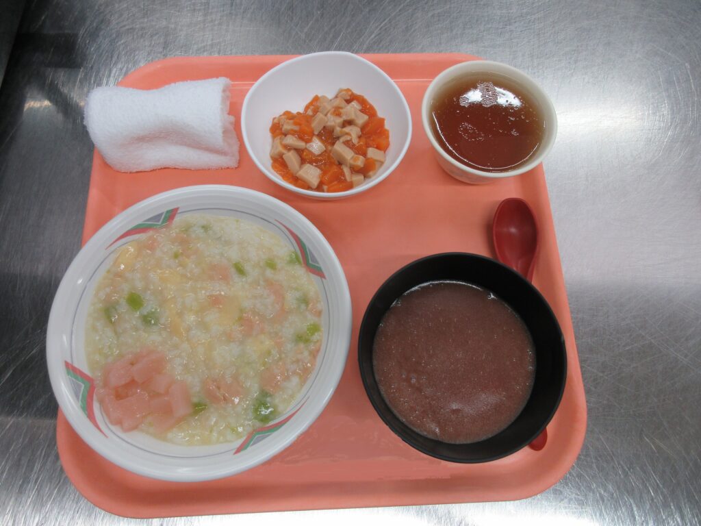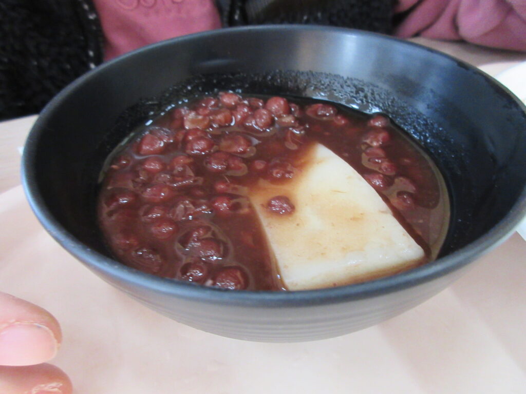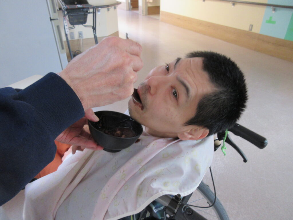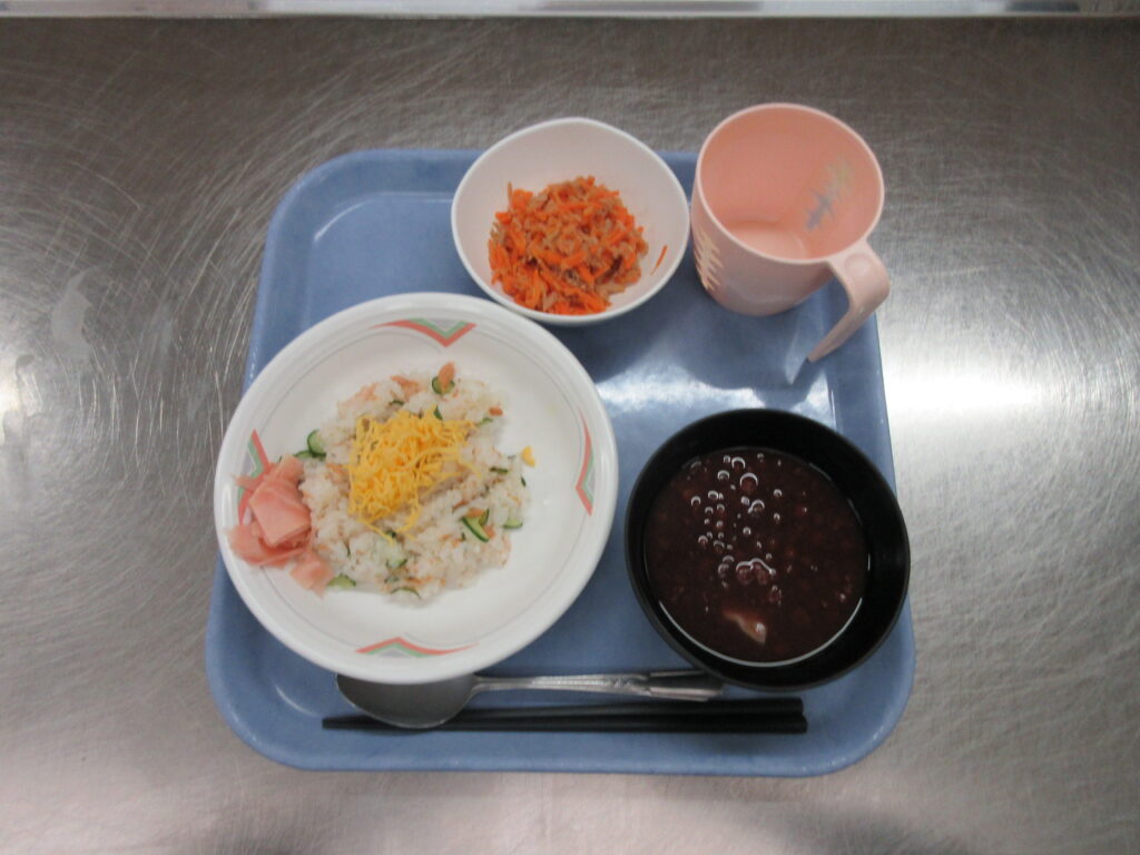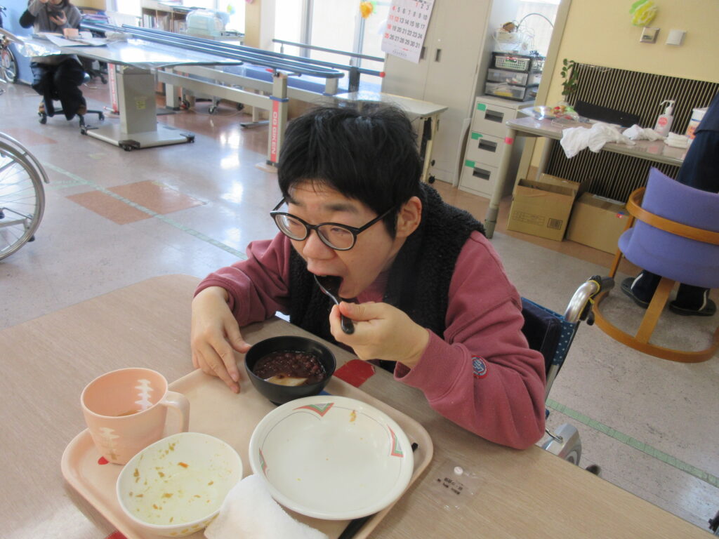 鏡開きということで「鮭ときゅうりの混ぜ寿司、ぜんざい、人参しりしり」を提供しました。ぜんざいのお餅は、粘りが少なくつるんと飲み込みやすいように、もち米から作ったお餅です。優しい甘さのぜんざいが「おいしい~」とおかわりしている方もいました。新しい一年も健やかに過ごすことができますように。