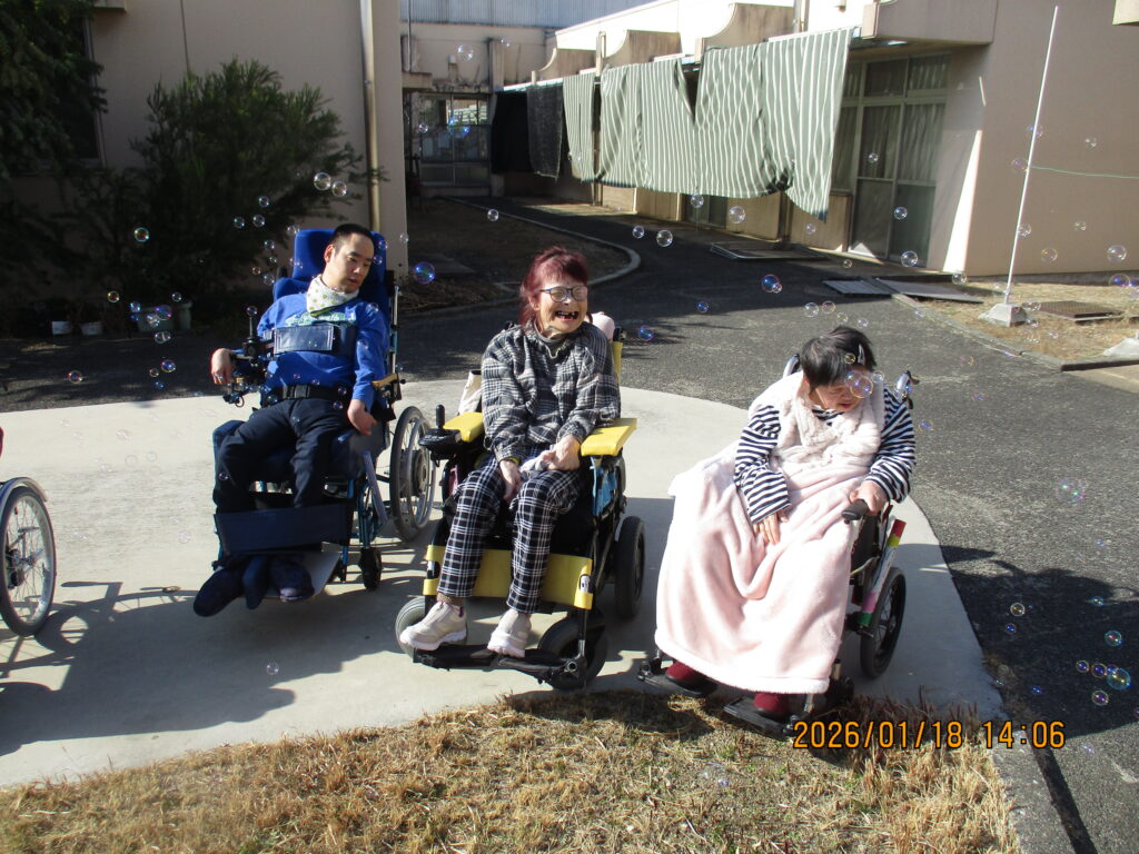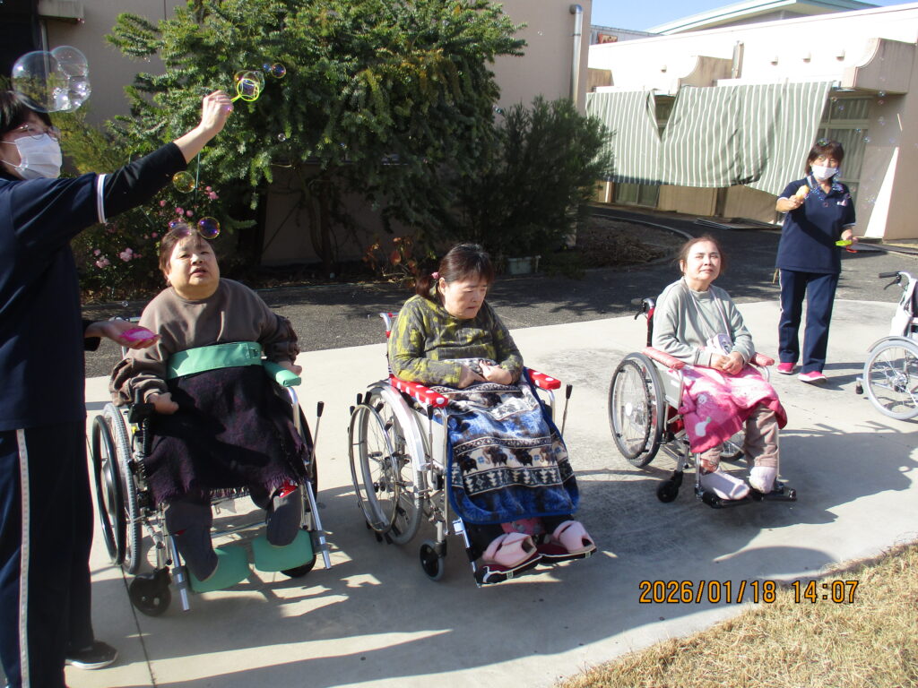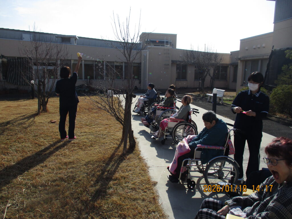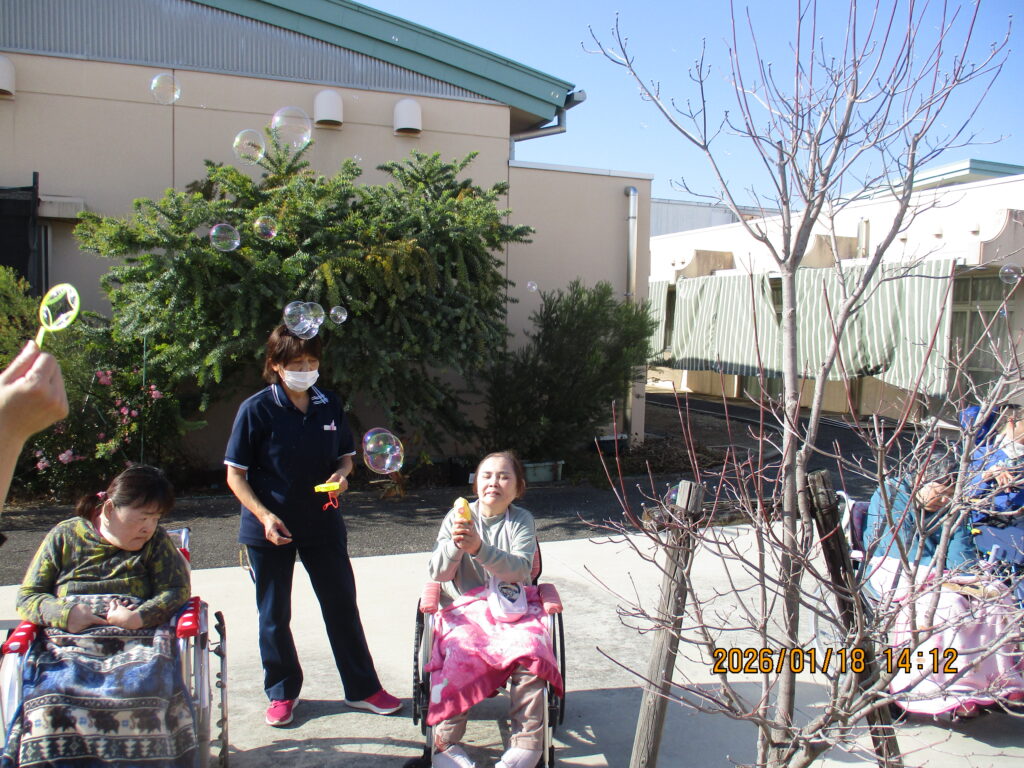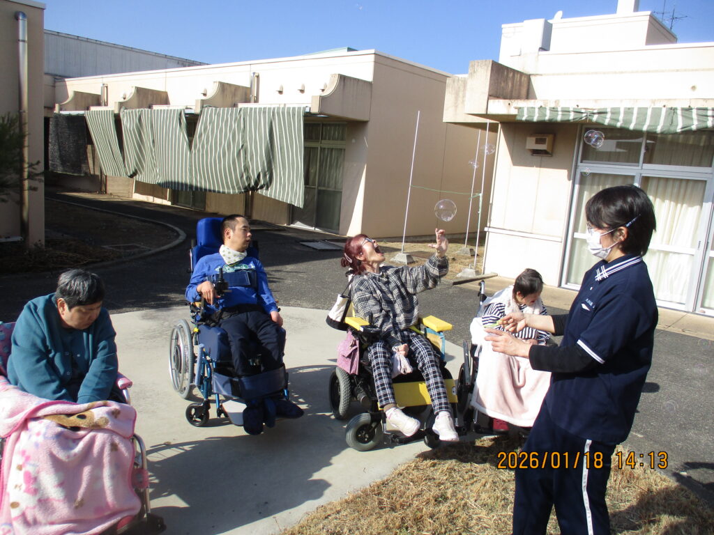 園庭でシャボン玉をしながら、雲一つない青空の下で日光浴をしました。歌を歌ったり、写真を撮ったり、シャボン玉の行方を目で追ったりしながら気分転換を図ることができたようでした。