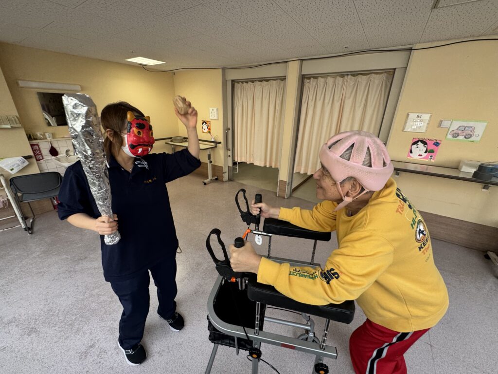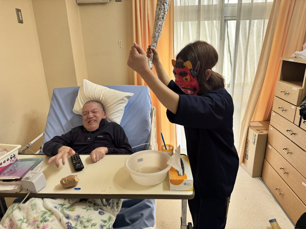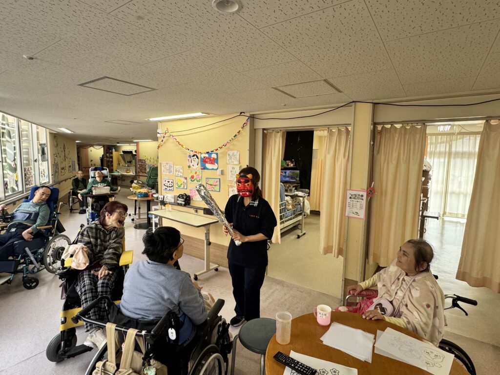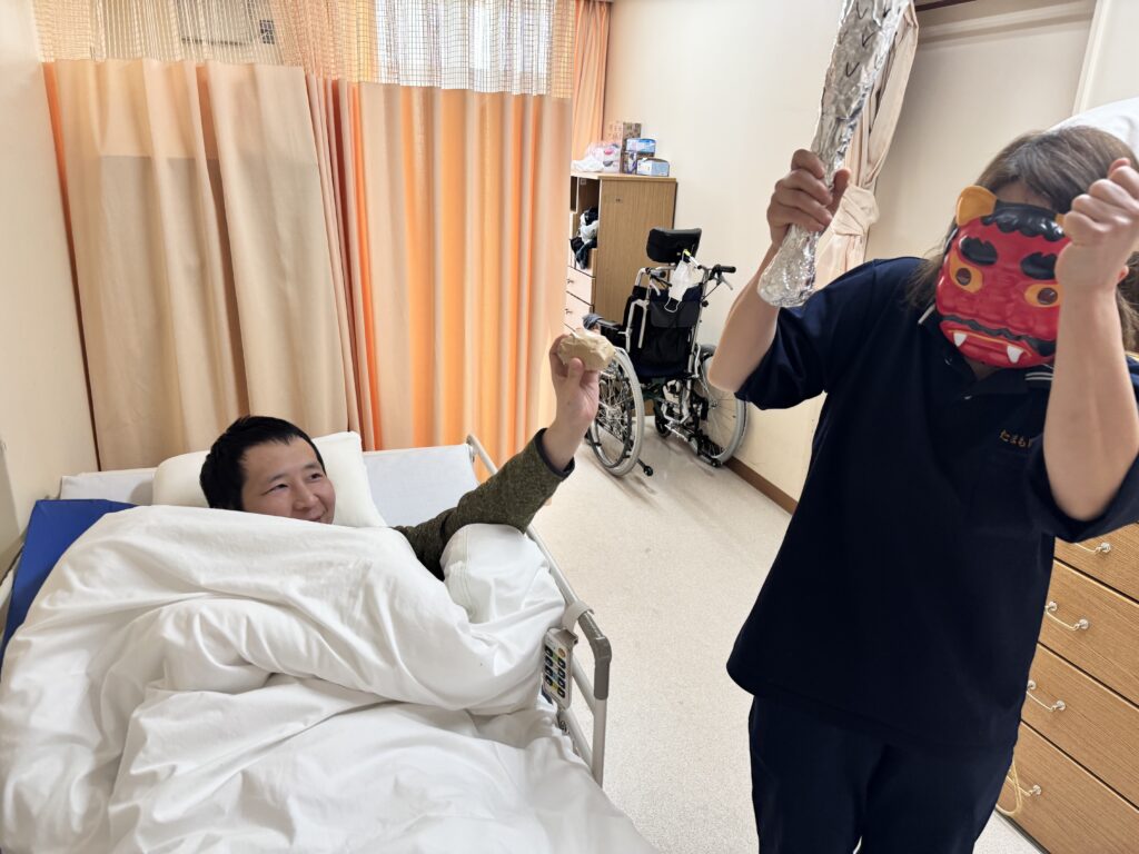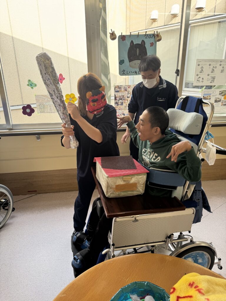 豆まきを行いました。『👹鬼は外、福は内』と掛け声で鬼に豆をぶつけ邪気を払い、代わりに福を呼び込み楽しんでいました。