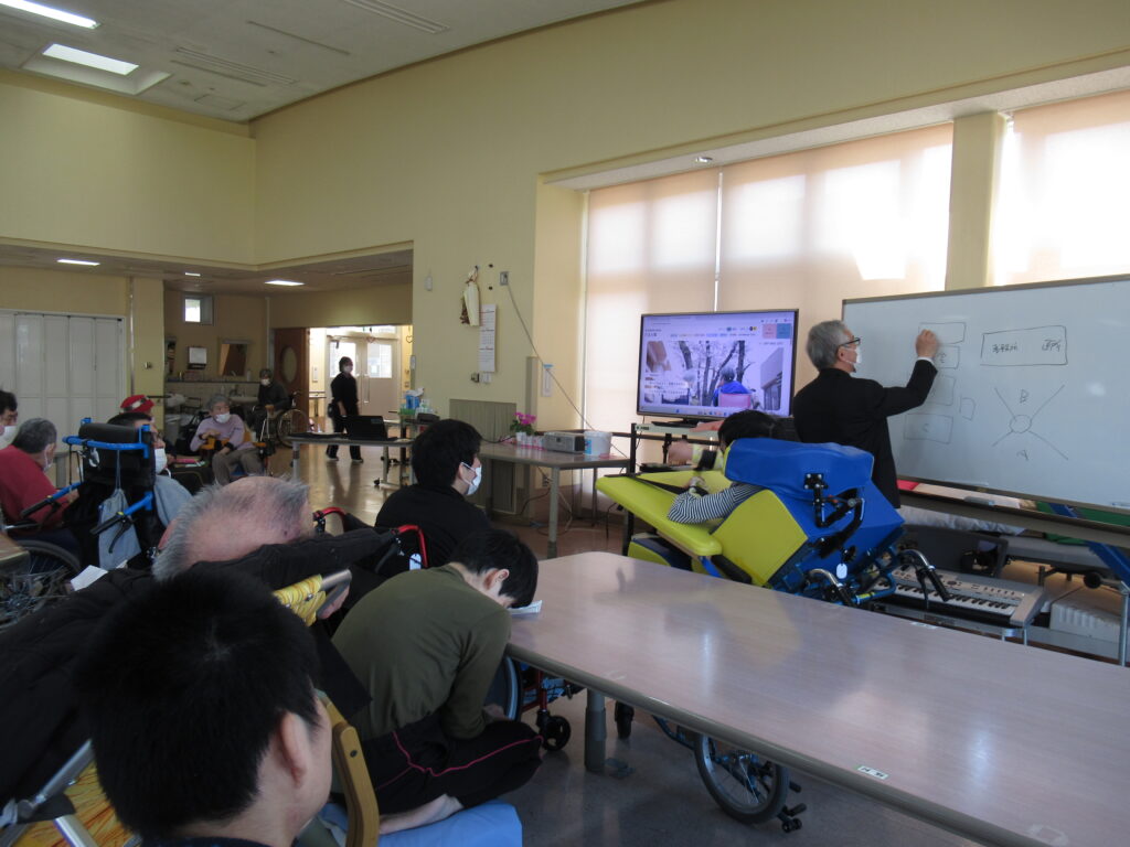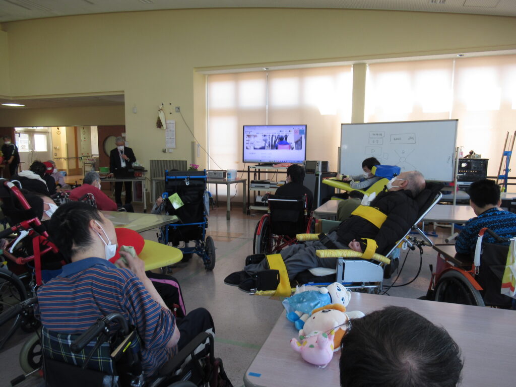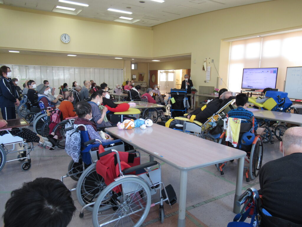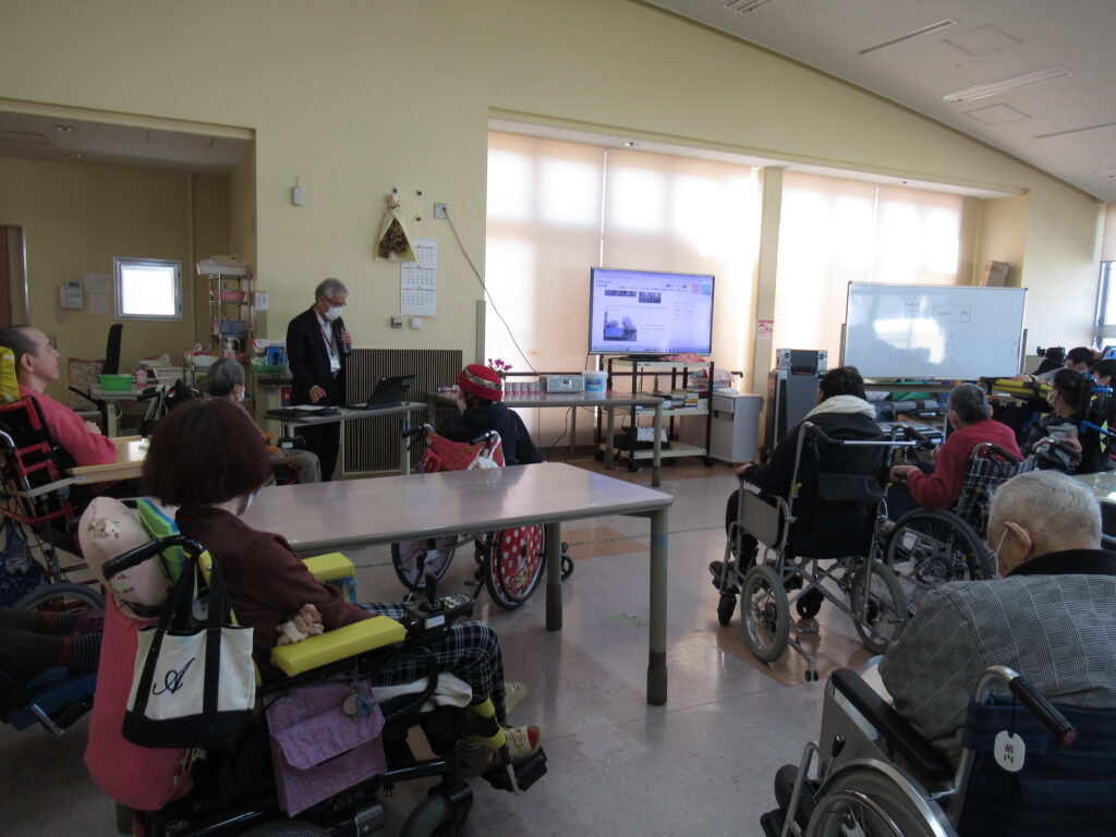 新型コロナウィルス感染症拡大防止対策のため休止していた、園長がその時々のトピックについて話をする月例会を約6年ぶりに開催しました。今回は、今年度、外壁補修など各種工事が続くことについて話がありました。
