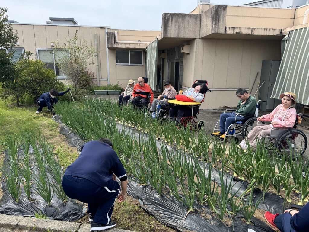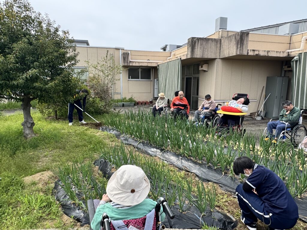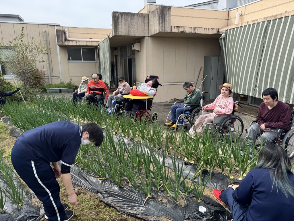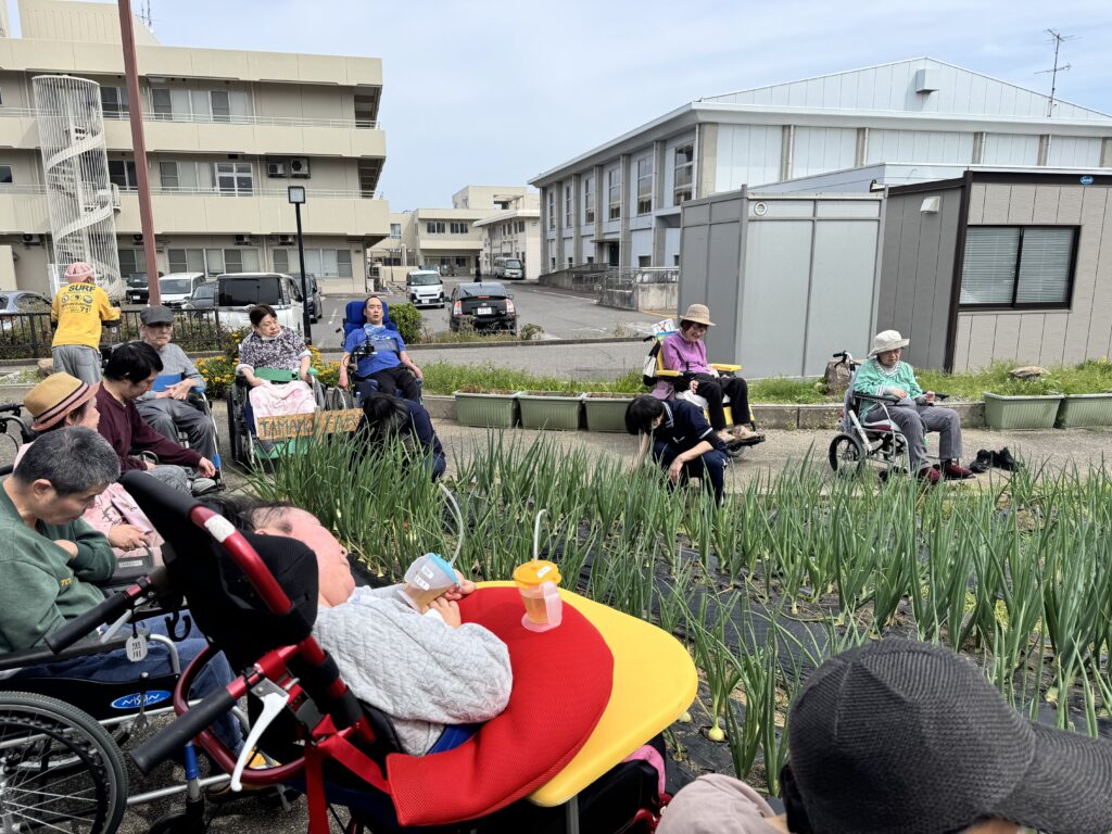 入所棟園庭でユニット企画の日光浴を行いました。あわせて、昨年秋に植えた玉ねぎの収穫に向けた準備行いました。園庭に出ると気持ちのいい日差しと風が吹く中で、春の歌を歌ったり体操をして気分転換をすることができました。