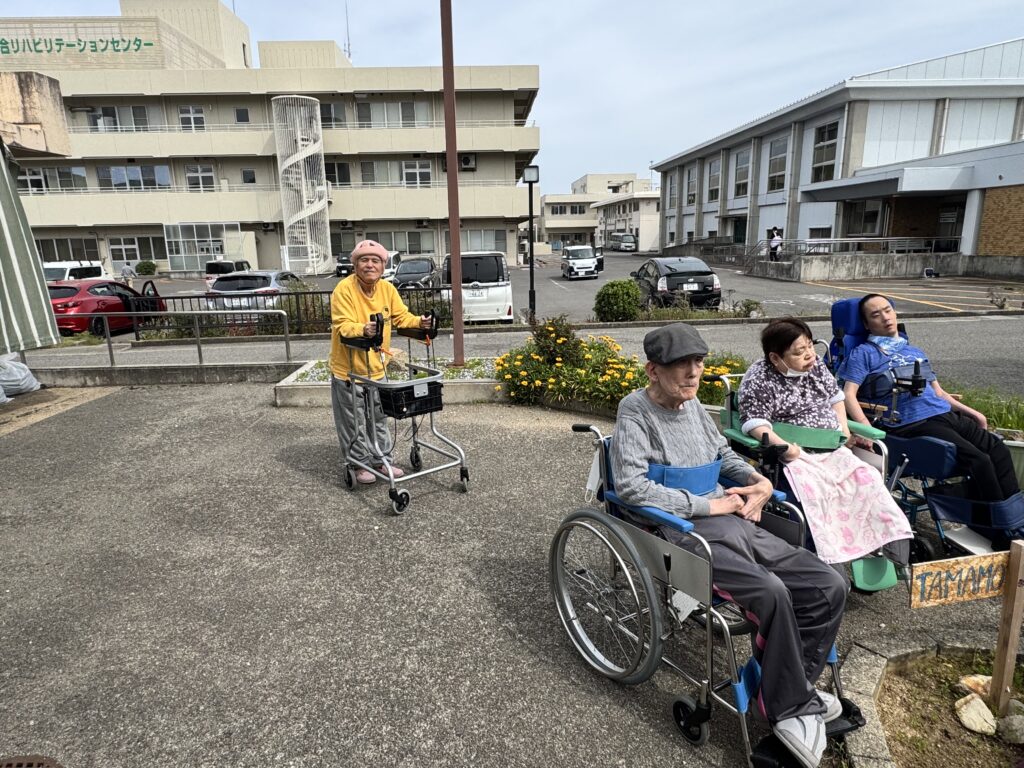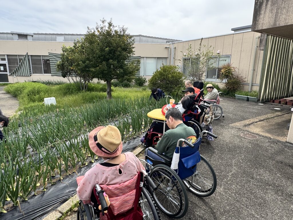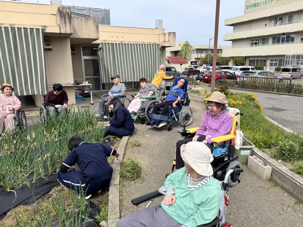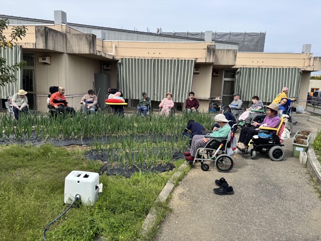 入所棟園庭でユニット企画の日光浴を行いました。あわせて、昨年秋に植えた玉ねぎの収穫に向けた準備行いました。園庭に出ると気持ちのいい日差しと風が吹く中で、春の歌を歌ったり体操をして気分転換をすることができました。
